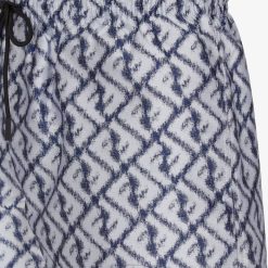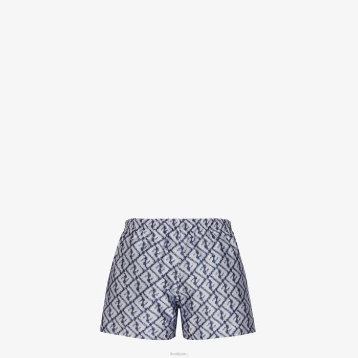 Bañador tipo shorts con cinturilla elástica y cordón. Confección en nailon con motivo ff diagonal efecto ikat estampado íntegramente en azul y blanco.