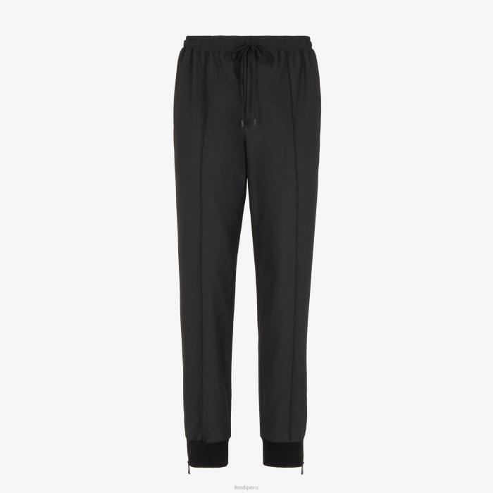 Pantalón jogger con cinturilla elástica con cordón. Raya del pantalón cosida e inserciones elásticas con cremalleras laterales en los tobillos. Confeccionado en tejido de lana elástica de color negro. adornado con una pequeña etiqueta Fendi de cuero negro aplicada en la cintura.