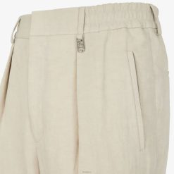 Pantalón pitillo con cinturilla elástica y pliegues en la parte delantera. Bolsillos en los laterales y bolsillo de ribete en la parte trasera. trabillas para cinturón y pliegue planchado en la pierna. Cierre de cremallera oculta. confeccionado en lino gris. pequeña placa fendi o’lock de metal en la presilla del cinturón.