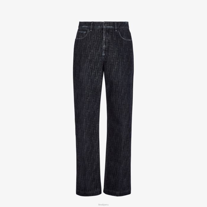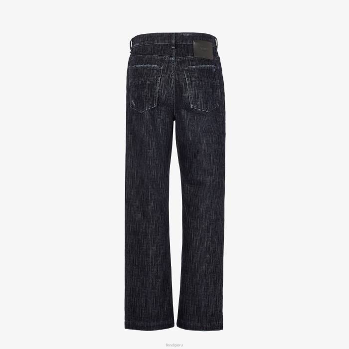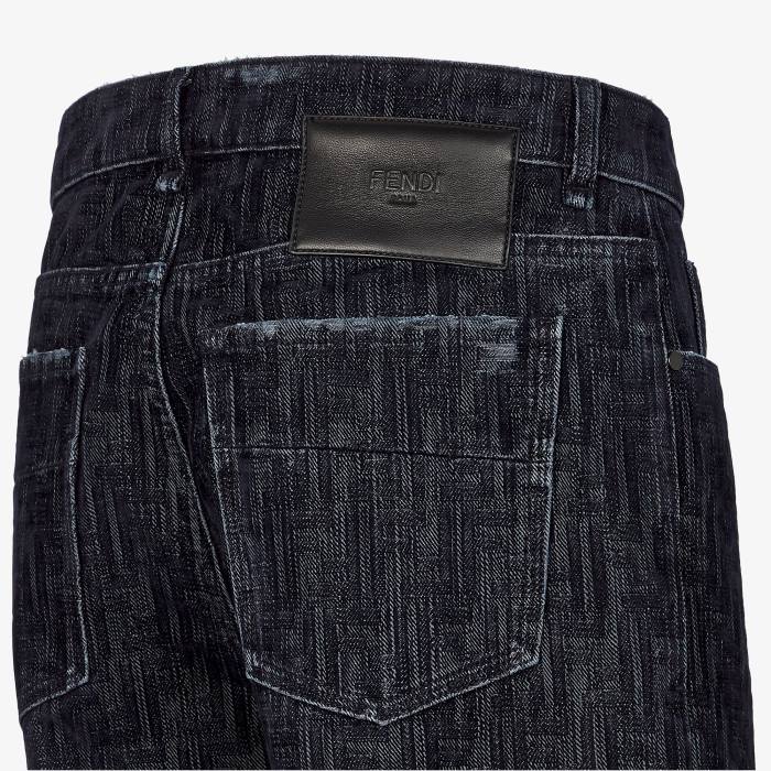 Pantalón recto de 5 bolsillos. cierre de cremallera y botón. Confección en denim azul con motivo ff flocado por toda la prenda. Tratamiento desgastado en la cintura y en los bolsillos. parche de cuero fendi en la parte trasera.