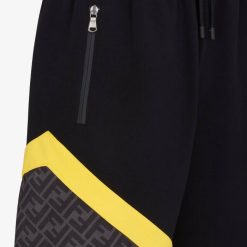 Bermudas con cintura elástica con cordón y bolsillos laterales con cremallera. hecho de jersey negro. adornado con una inserción diagonal negra y gris y una franja amarilla en contraste.