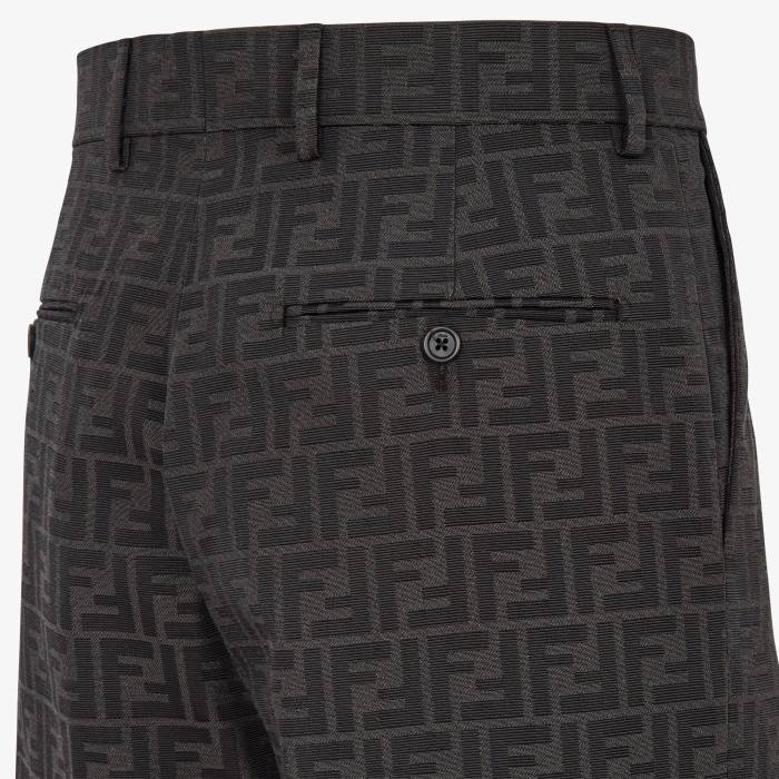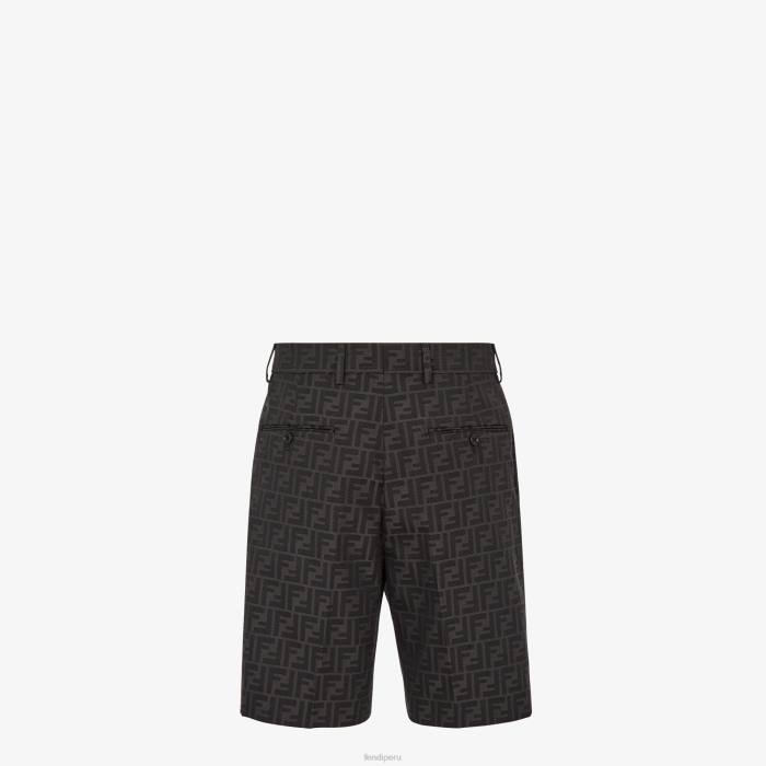 Pantalón bermudas con trabillas en cintura. bolsillos laterales y bolsillos de ribete con botón en la espalda. cierre de cremallera oculta. Confección en tejido con motivo ff jacquard negro.