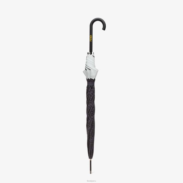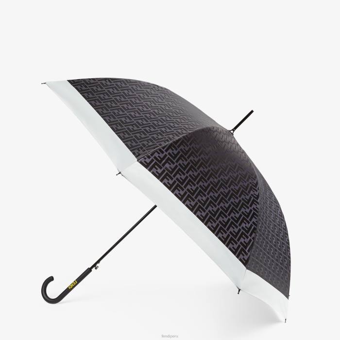Paraguas grande confeccionado en tejido técnico negro con motivo ff. adornado con borde blanco termosellado.