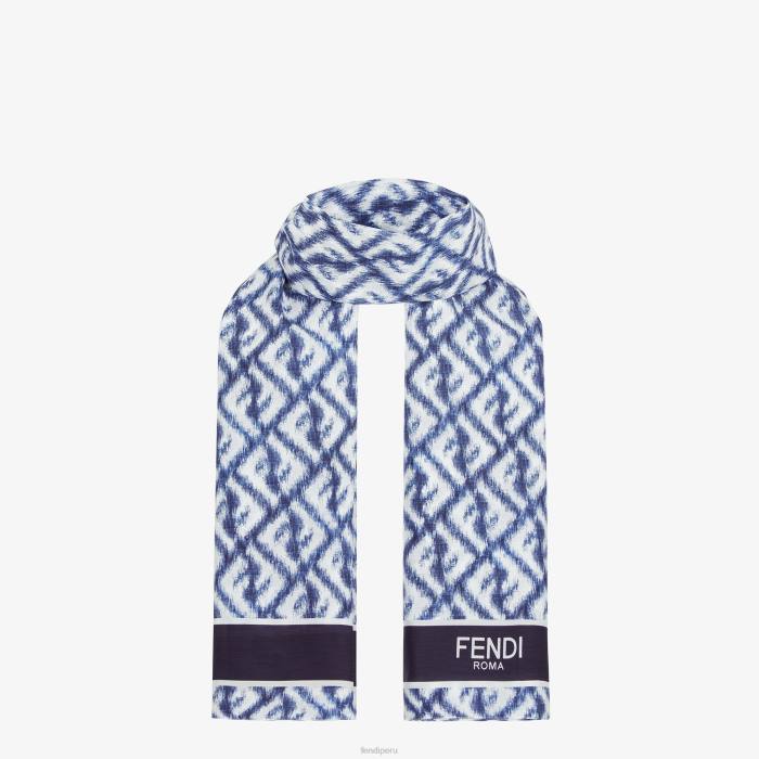 Pareo rectangular confeccionado en algodón y seda con motivo ff diagonal efecto ikat estampado íntegramente en blanco y azul. Borde de color liso y logotipo de Fendi Roma del mismo color.