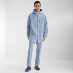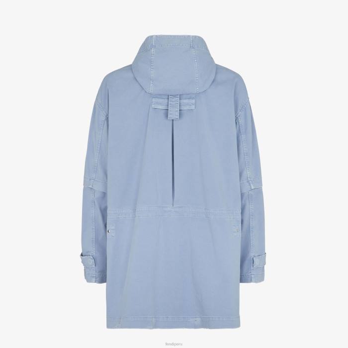 parka extragrande con capucha. tres bolsillos con solapa de gran tamaño en la parte delantera. Cordón interno ajustable en cintura trasera, correas de ajuste en puño y cintura. Cierre de cremallera frontal con cursor Fendi O’lock. Confección en gabardina de algodón elástico en color azul claro. Detalles destruidos con efecto desgastado. adornado con una etiqueta Fendi de jacquard bordada en el bolsillo delantero izquierdo.