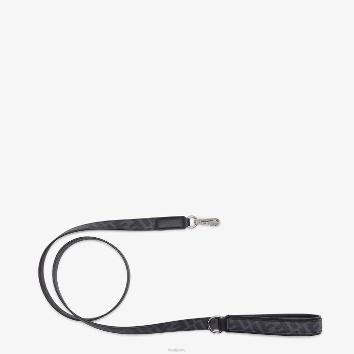 Correa para perros con anilla y clip personalizada con inscripción Fendi. Confección en tela con motivo ff en negro y gris. Detalles de cuero negro. Artículos metálicos con acabado en paladio.