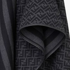 poncho reversible con flecos en el bajo. Confección en cachemir y lana de color negro y gris. Un lado está rematado con un motivo ff y el otro con un estampado de pequín. Bordes ribeteados en cuero negro.