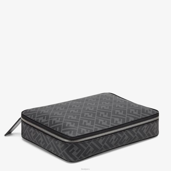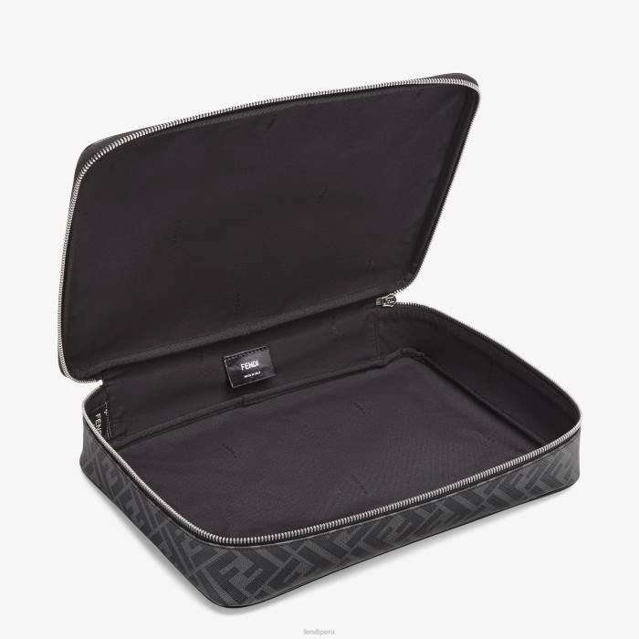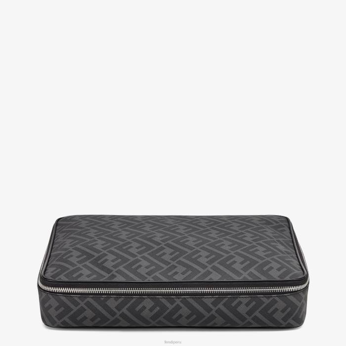 Portacamisas con un solo compartimento y cierre de cremallera. Confección en tela con motivo ff en gris y negro. adornado con detalles de cuero negro y tirador de cremallera de cuero con letras fendi roma. Artículos metálicos con acabado en paladio.