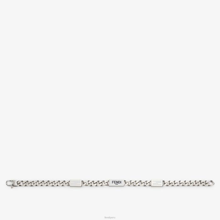 pulsera de eslabones cerrada con un pequeño clip. fabricado en metal con acabado paladio. decorado con detalles de baguette ff esmaltados en blanco y una placa esmaltada en blanco con letras fendi roma en negro.