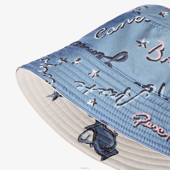 Gorro de pescador reversible confeccionado en sarga de seda. un lado en tonos blancos y el otro en azul, ambos están decorados con un estampado integral con motivos astrológicos fendi en color en contraste.