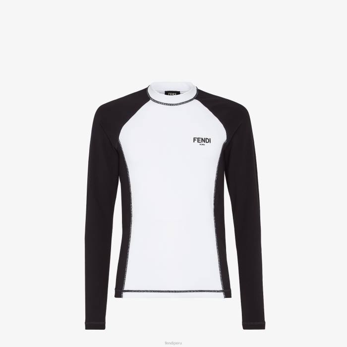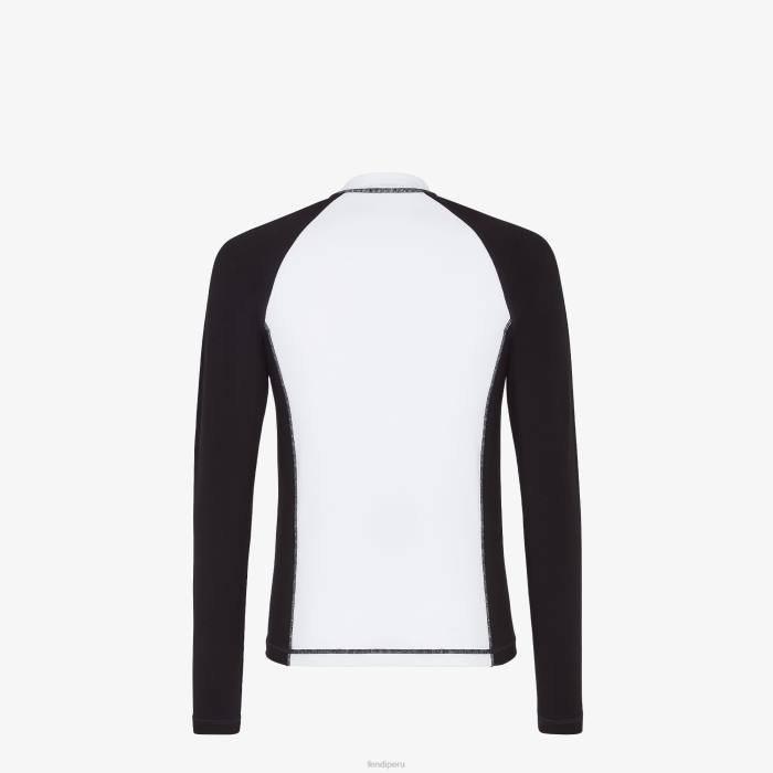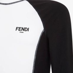 Jersey ceñido al cuerpo con cuello alto y manga larga raglán. confeccionado en algodón elástico blanco con inserciones negras y costuras negras. Logotipo de fendi roma en el pecho.