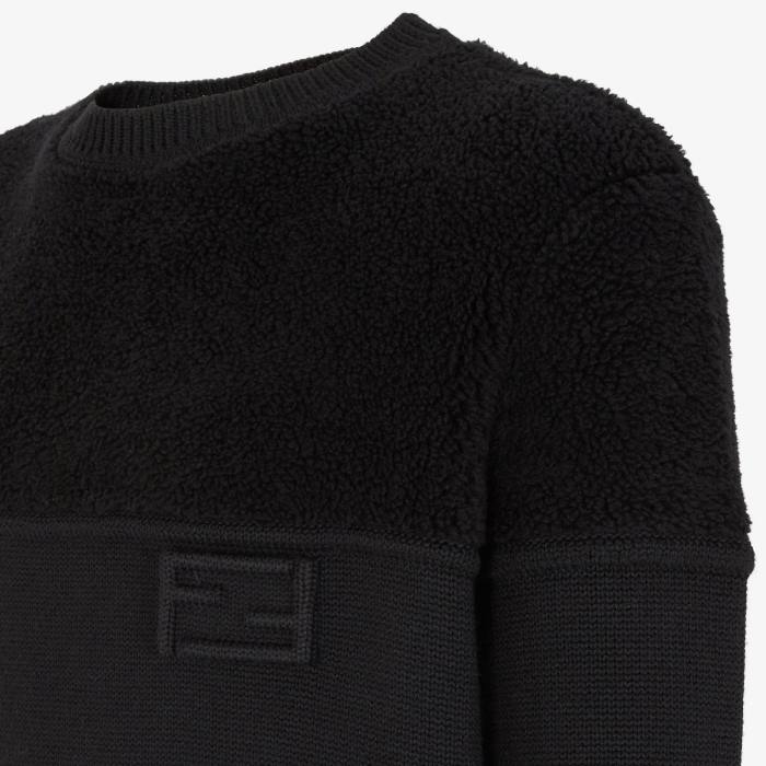 Jersey de manga larga y cuello redondo. Cuello, puños y bordes de canalé. Confeccionado en lana y seda de color negro, con aplicación efecto osito en la parte superior. Marca con detalle de baguette ff en relieve en la parte delantera.