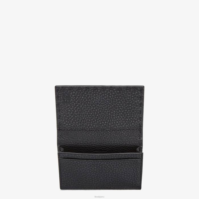 Tarjetero con solapa, una ranura y un bolsillo central. Confección en piel cuoio romano negra. adornado con letras fendi roma y bordes rematados con costuras selleria cosidas a mano. Artículos metálicos con acabado en paladio.