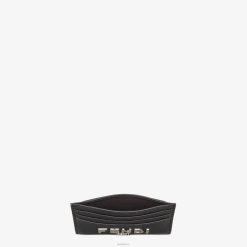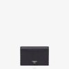 Tarjetero con seis ranuras y bolsillo central plano. Confeccionado en piel flor negra. Letras Fendi Roma y artículos metálicos con acabado de rutenio ultranegro.