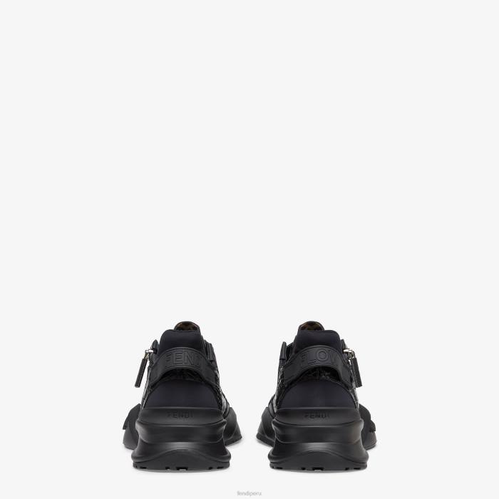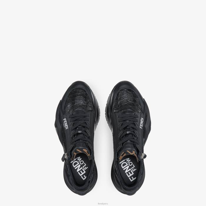 Zapatillas slip-on con cordones elásticos ajustables, cremallera lateral y suela ondulada con f grabada. Letras Fendi Flow grabadas en los talones. Confeccionado en piel de caimán negro. adornado con una lengüeta de lycra con motivo ff. suela de goma ligera de color blanco con detalle de f diagonal negra.