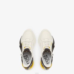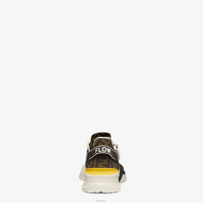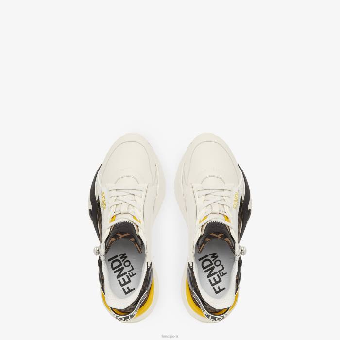 Zapatillas sin cordones con cordones elásticos, cremallera lateral y suela ondulada con f grabada. Letras Fendi Flow grabadas en los talones. Confección en piel de color blanco con detalles en tejido jacquard ff. adornado con una lengüeta de lycra con motivo ff. suela de goma ligera de color blanco con detalle de f diagonal negra.