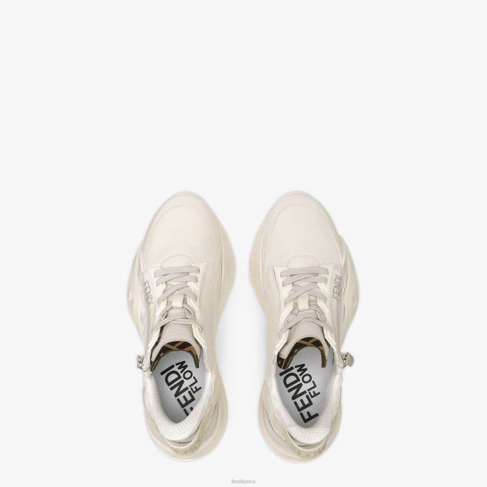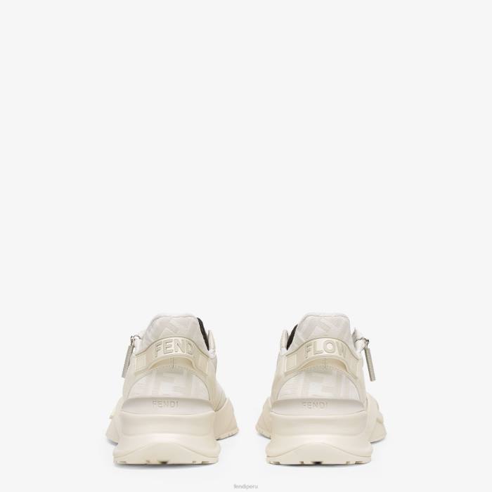 Zapatillas sin cordones con cordones elásticos, cremallera lateral y suela ondulada con f grabada. Letras Fendi Flow grabadas en los talones. Confección en piel blanca e inserciones de tejido ff en blanco y gris claro. adornado con detalles de lycra con motivo ff. Suelas ligeras de goma blanca con detalle de f diagonal a juego.