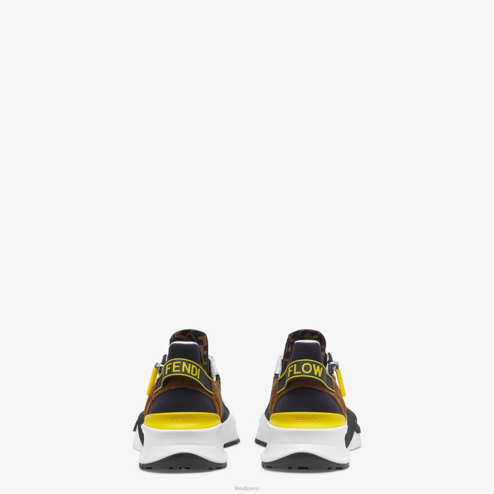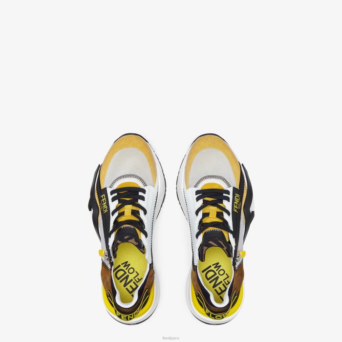 Zapatillas sin cordones con cordones elásticos, cremallera lateral y suela ondulada con f grabada. Letras Fendi Flow grabadas en los talones. confeccionada en una mezcla de tejidos técnicos y ante en blanco, negro y amarillo. adornado con detalles de lycra. lengüeta con motivo ff. suela de eva.
