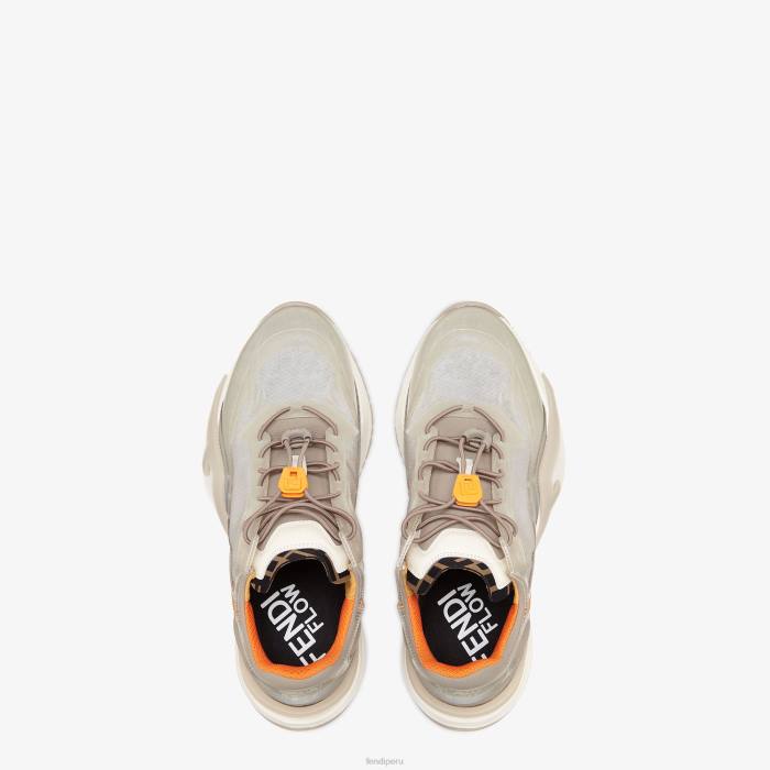 Zapatillas slip-on con cordones elásticos ajustables, tope ff y suela ondulada con f grabada. Letras Fendi Flow grabadas en los talones. Confeccionado en nailon color beige claro con revestimiento inyectado. Detalles de licra con motivo ff. Suelas ligeras de goma blanca con detalle de f diagonal beige.
