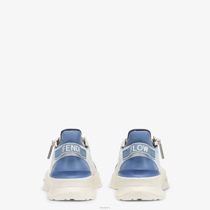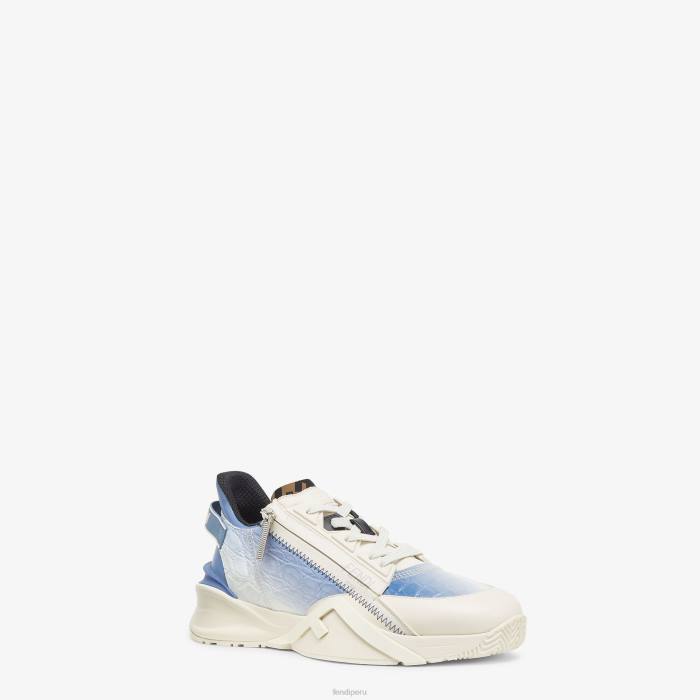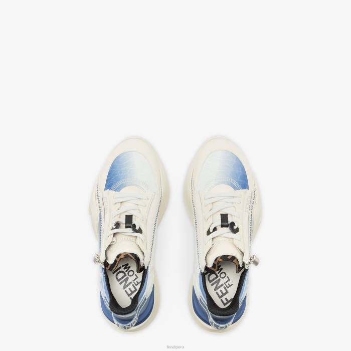 Zapatillas sin cordones con cordones elásticos ajustables, cremallera lateral y suela ondulada con f grabada. Letras Fendi Flow grabadas en los talones. Confeccionado en piel de caimán de color blanco con degradado en azul claro. adornado con detalles de lycra con motivo ff. Suelas ligeras de goma blanca con detalle de f diagonal a juego.