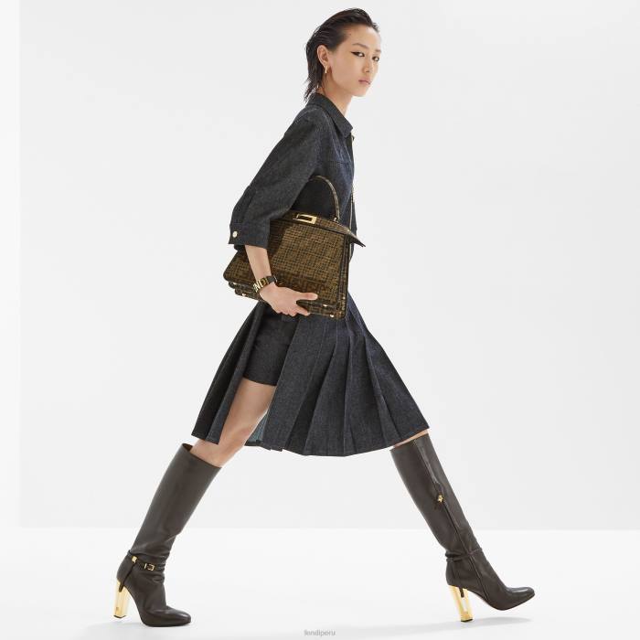 Caja de acero inoxidable con forma de letra D con revestimiento de PVD dorado brillante. Corona con logo ff grabado. Esfera negra brillante, índices y agujas de corte radial con revestimiento de PVD dorado. Brazalete de piel negra, 16 mm, con inscripción Fendi y hebilla con revestimiento de PVD dorado.