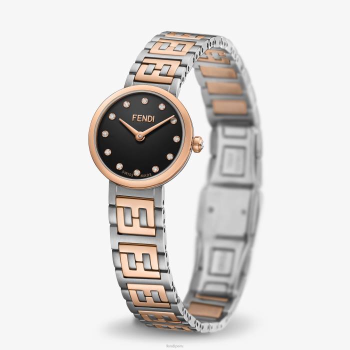 caja de acero inoxidable pulido y cepillado, bisel y corona de acero inoxidable de color oro rosa, corona engastada con un diamante de aproximadamente 0,02 quilates. Esfera lacada en negro engastada con 12 diamantes de aproximadamente 0,03 quilates y agujas de oro rosa. Brazalete de acero inoxidable con acabado satinado y eslabones centrales pulidos en color oro rosa con logo ff y hebilla desplegable.
