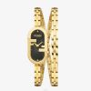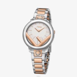 Caja redonda de 28 mm de acero inoxidable en color dorado brillante y satinado con inserción f de acero inoxidable tono sobre tono. Esfera de rayos de sol dorada descentrada con estampado ff brillante, índices y agujas dorados. Brazalete de acero tono sobre tono, 11,95/10 mm, con motivo ff grabado y hebilla desplegable.