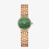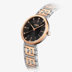 caja de acero inoxidable pulido y cepillado, bisel y corona de acero inoxidable de color oro rosa, corona engastada con una piedra de ónix blanco. Esfera lacada en negro, índices y agujas en color oro rosa. Brazalete de acero inoxidable con acabado satinado y eslabones centrales pulidos en color oro rosa con logo ff y hebilla desplegable.