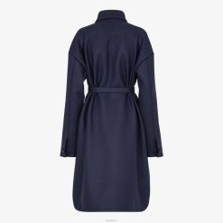 Abrigo de corte recto con cuello camisero y manga escotada. maxibolsillos de parche en el pecho. Cierre sencillo con botones y cinturón a juego en la cintura con hebilla metálica Fendi O’lock. hecho de lana azul oscuro. Los bolsillos están rematados con un motivo de costura Selleria en relieve. Botones personalizados ff karligraphy.