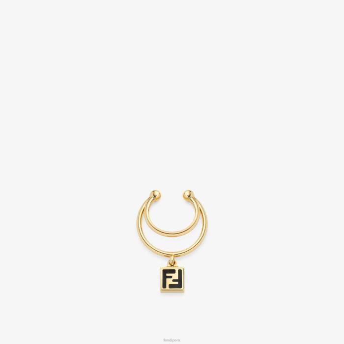 Pendiente de aro con colgante pequeño cuadrado. fabricado en metal con acabado dorado. decorado con motivo ff esmaltado en negro.