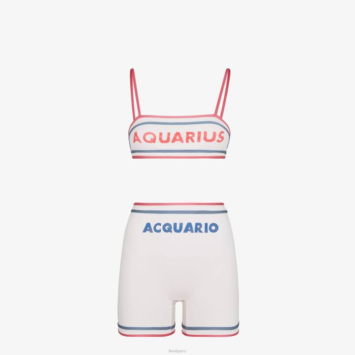 Bañador compuesto por top bandeau de tirantes finos y short ajustado. confeccionada en lycra blanca con estampado de letras fendi astrology en contraste. adornado con doble ribete en los bordes en rosa y azul claro. bolso a juego con cordón y logo de fendi roma.