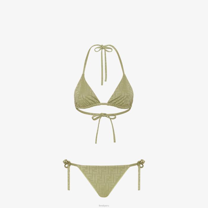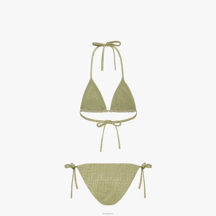 Bañador con parte superior y braguita triangular con lazos en la cadera. Confección en lycra verde pálido con motivo ff en jacquard por toda la prenda.