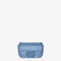 Bañador de dos piezas con sujetador triangular y braguita. Confeccionado en lycra azul claro brillante. Adornado con detalle de ff de metal con acabado rutenio en la parte delantera. minibolso baguette ff a juego.