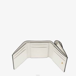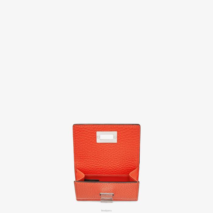 Cartera peekaboo compacta de tres pliegues con gran compartimento interno para billetes y tres tarjeteros ocultos. Monedero externo con icónico cierre giratorio. Confección en piel cuoio romano roja. Artículos metálicos con acabado en paladio.