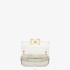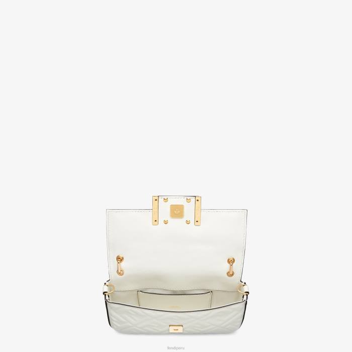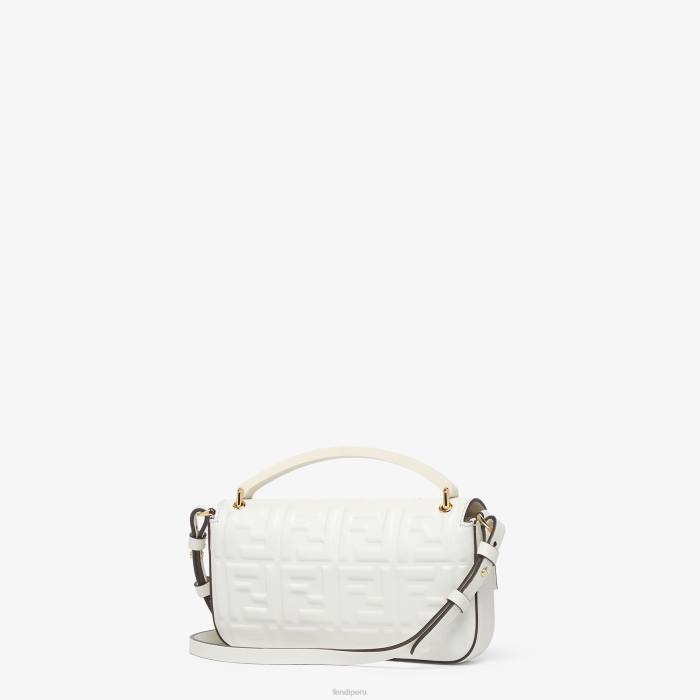 Funda para smartphone baguette con solapa frontal y cierre con botón magnético ff. asa pequeña, bandolera ajustable y extraíble. Confección en piel blanca con motivo ff tridimensional en relieve. Accesorios de metal con acabado dorado vintage.