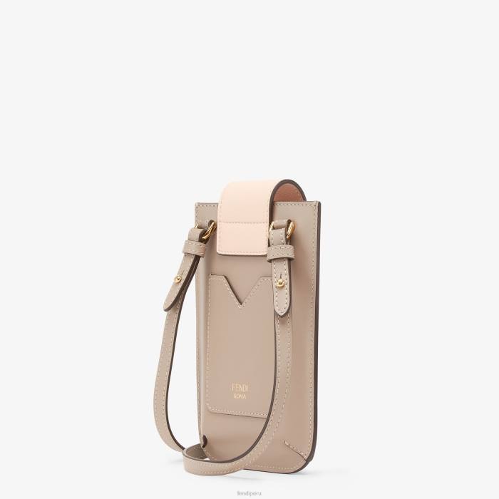 Funda para smartphone ff rombos con solapa frontal. Cierre con motivo ff inclinado y botón magnético. bolsillo plano en la espalda y bandolera desmontable. Confeccionado en piel gris tórtola con detalles en piel rosa palo. Accesorios de metal con acabado dorado vintage.