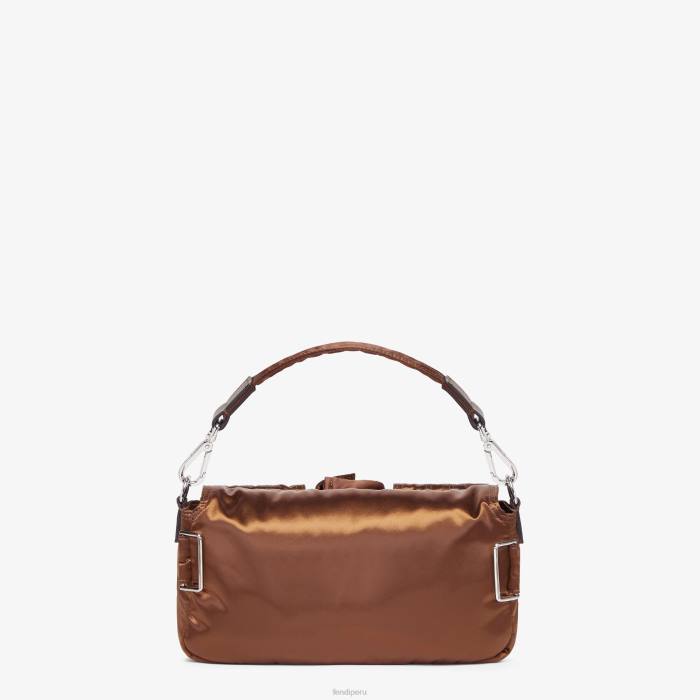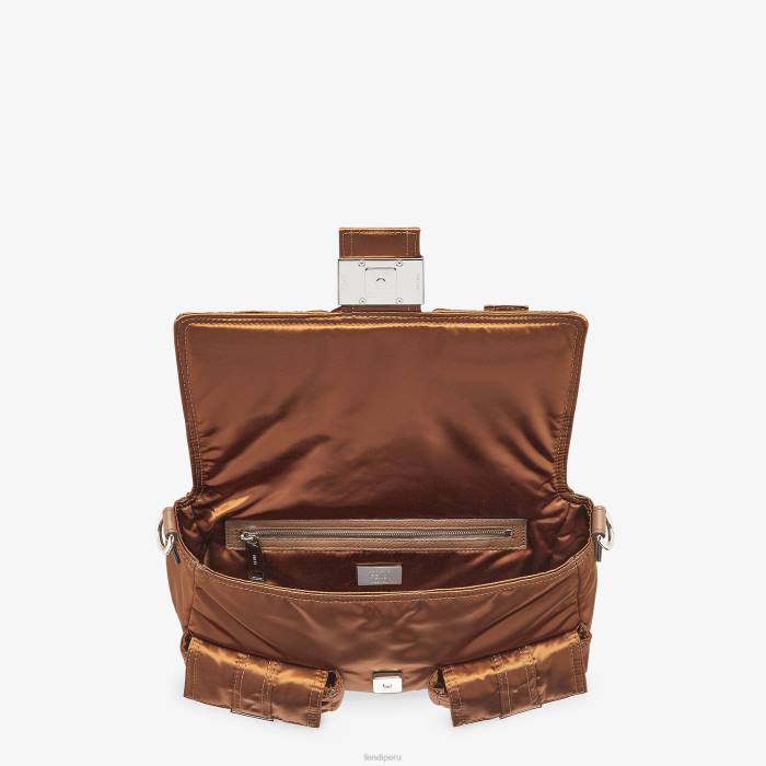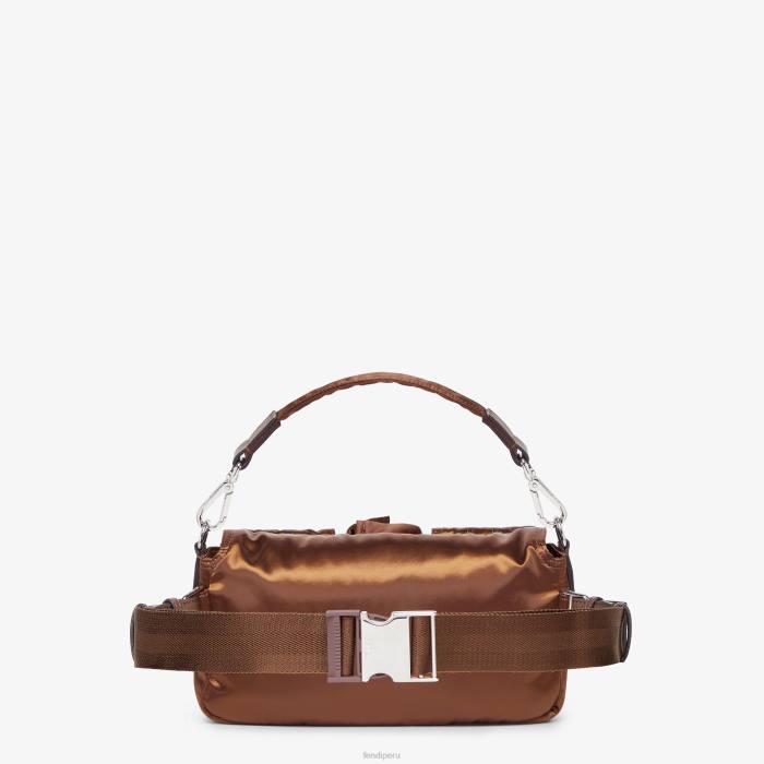 Bolso multibolsillos baguette confeccionado en nailon reciclado brillante de color marrón, con cinco bolsillos de parche de diferentes tamaños. los bolsillos y la solapa delantera están decorados con el icónico cierre ff. adornado con cuero negro.