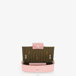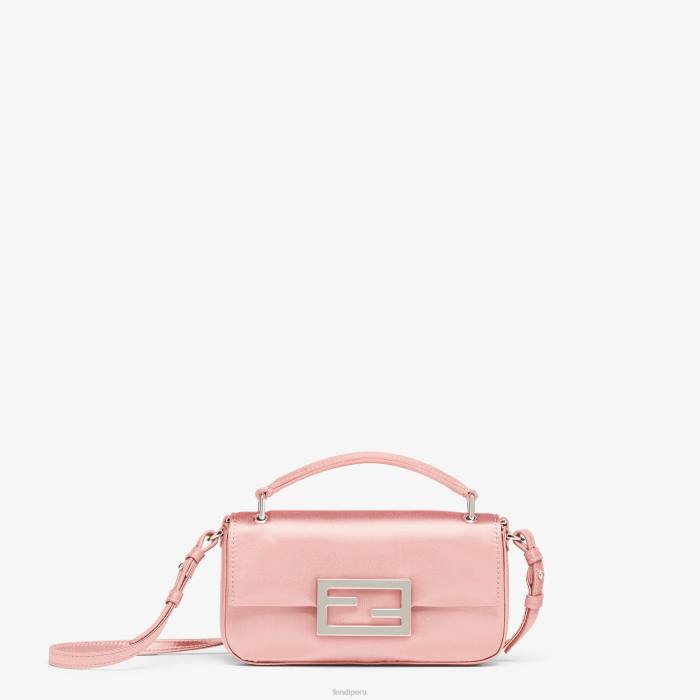 Funda para smartphone baguette con solapa frontal y cierre con botón magnético ff. Asa pequeña y bandolera desmontable. Confección en raso de seda rosa. Artículos metálicos con acabado en paladio.