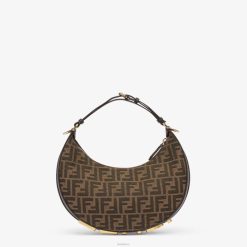 Bolso hobo pequeño confeccionado en tejido con motivo jacquard ff marrón, decorado con letras fendi vintage de metal dorado visibles al llevar el bolso debajo del brazo.