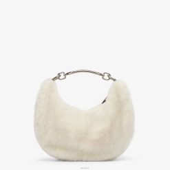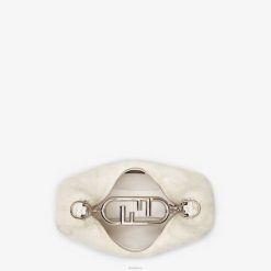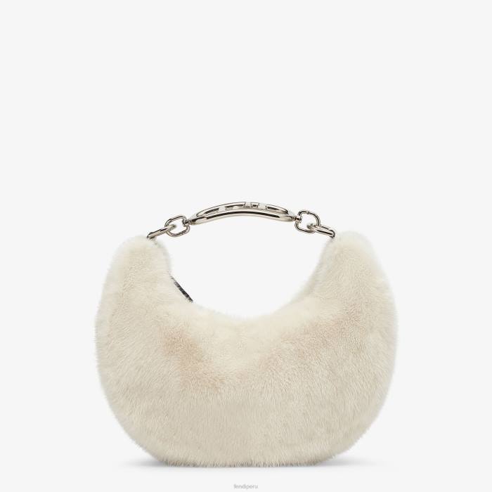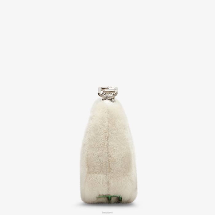 Bolso hobo pequeño confeccionado en suave visón blanquecino, decorado con metal verde y letras Fendi de plexiglás visibles al llevar el bolso debajo del brazo.