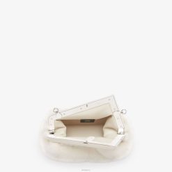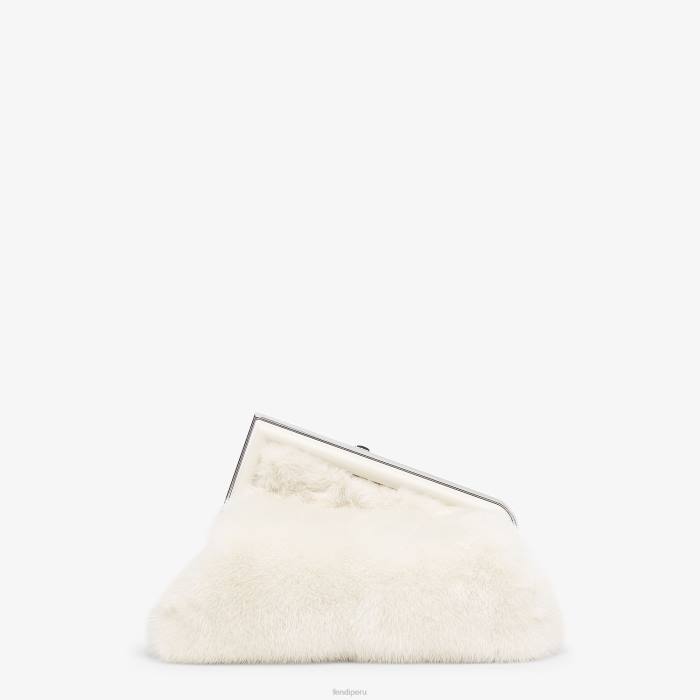 Primer bolso Fendi pequeño confeccionado en visón suave de color blanquecino con cierre en forma de F de metal extragrande encuadernado en piel de napa tono sobre tono.