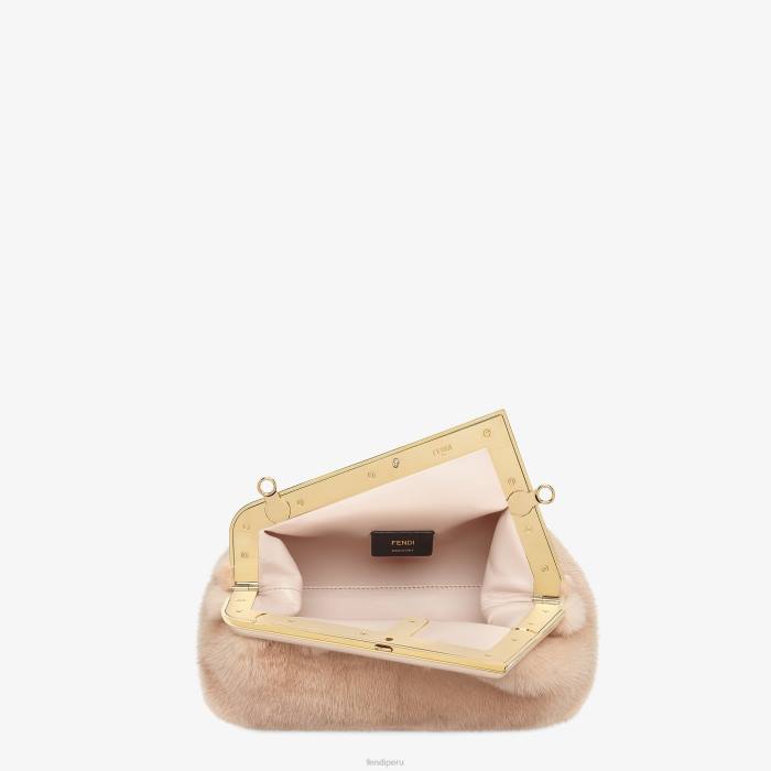 Primer bolso Fendi pequeño confeccionado en suave visón rosa pálido con cierre en forma de F de metal de gran tamaño encuadernado en piel de napa tono sobre tono.