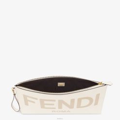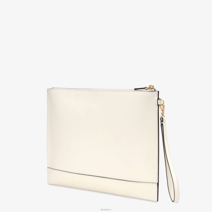Bolsa grande con asa de pulsera extraíble. cierre de cremallera. Confección en piel blanca con motivo fendi roma estampado térmicamente. artículos de metal con acabado dorado.
