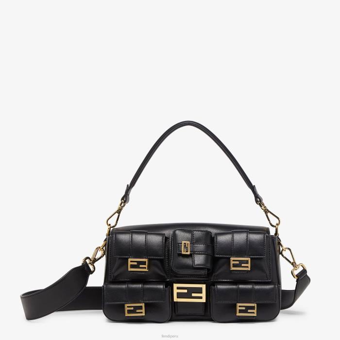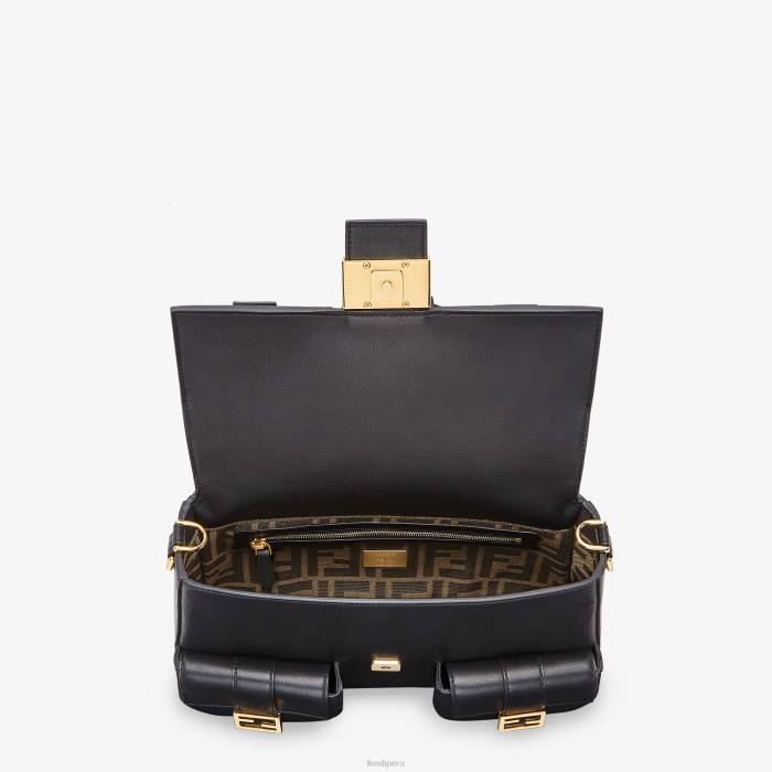 Bolso baguette multibolsillos confeccionado en suave napa negra, con cinco bolsillos aplicados de diferentes tamaños. los bolsillos y la solapa delantera están decorados con el icónico cierre ff.