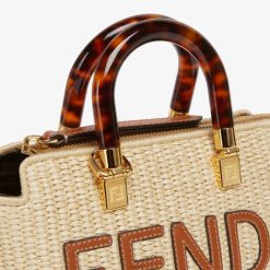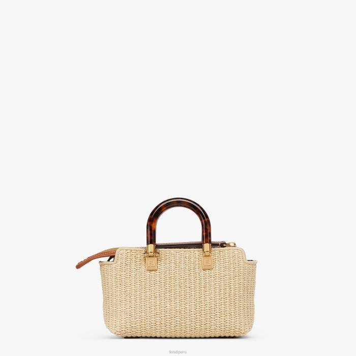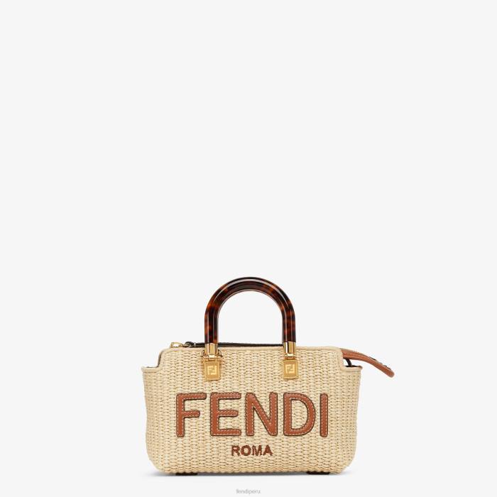icónico mini bolso by the way boston, confeccionado en paja de color natural tejida con efecto punto arroz y letras fendi roma en cuero marrón. Asas rígidas de plexiglás con efecto carey. cierre de cremallera.