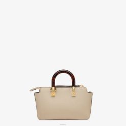 icónico mini bolso by the way boston confeccionado en piel gris tórtola con letras fendi roma estampadas en caliente y asas rígidas de plexiglás con efecto carey. cierre de cremallera.