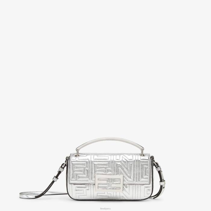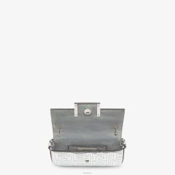 Funda para smartphone baguette con solapa frontal y cierre con botón magnético ff. asa pequeña, bandolera ajustable y extraíble. Este modelo, que forma parte de la edición limitada de Fendi by Marc Jacobs, está confeccionado en cuero laminado plateado con un gran acolchado Fendi Roma con efecto tridimensional. Artículos metálicos con acabado en paladio.
