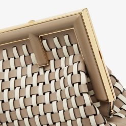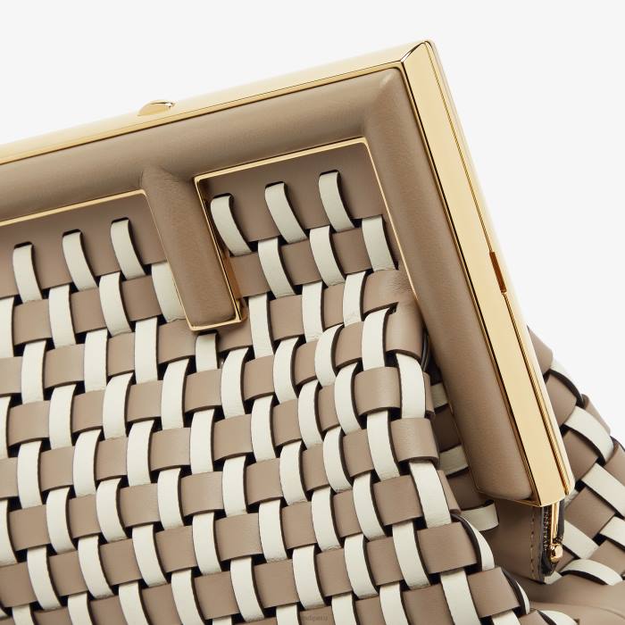 Primer bolso pequeño de Fendi confeccionado en piel tejida a mano en color gris tórtola y blanco. Cierre de metal f extragrande encuadernado en piel de napa gris tórtola.