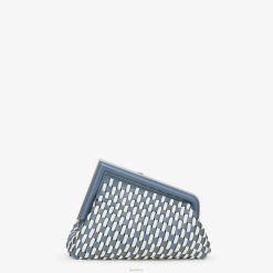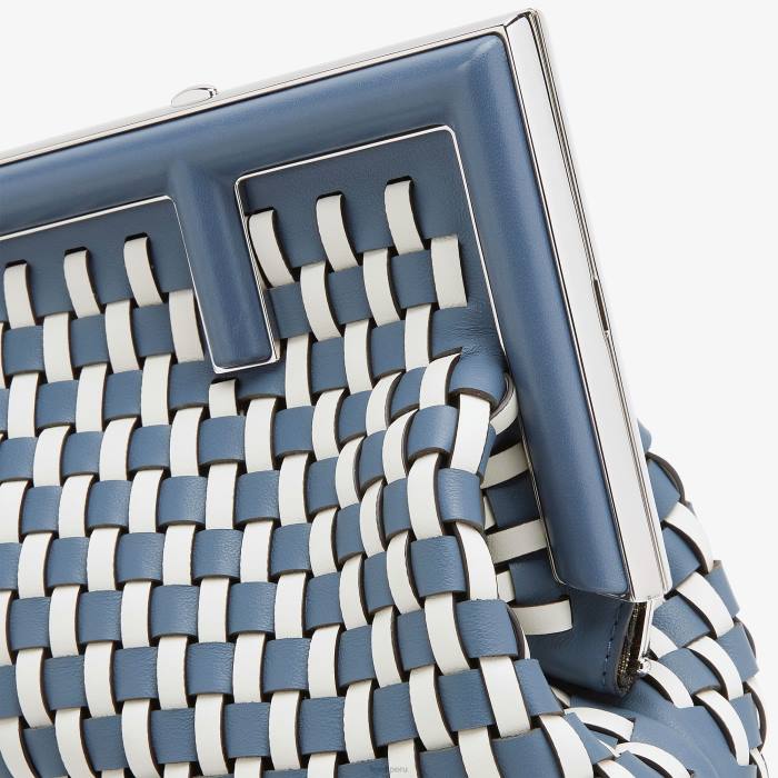 Primer bolso pequeño de Fendi realizado en piel tejida a mano en color azul y blanco. Cierre oversize de metal con forma de F, forrado en piel de napa azul.