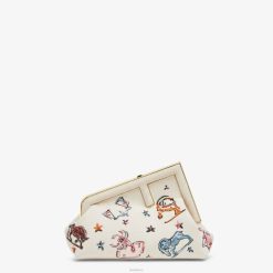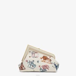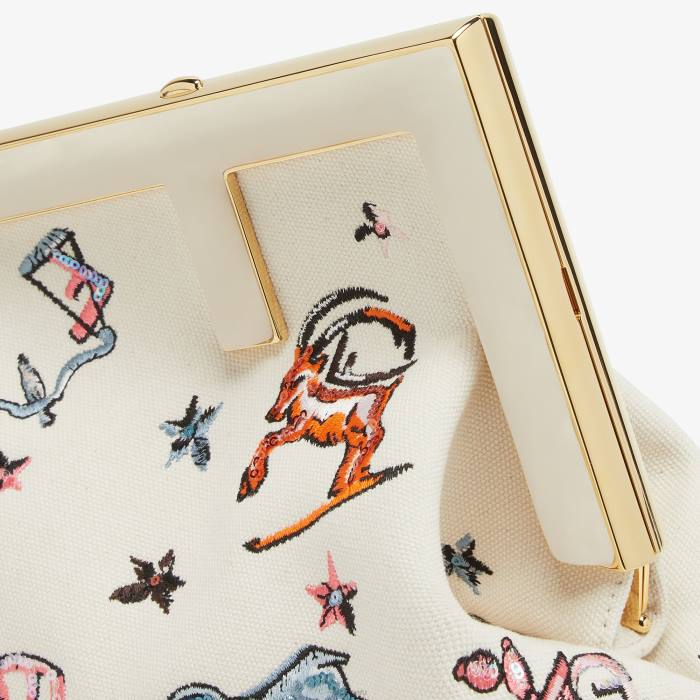 Primer bolso pequeño de Fendi confeccionado en lona en tono natural, con un exquisito motivo de astrología Fendi bordado en hilos y lentejuelas multicolores. Cierre con forma de F de metal extragrande encuadernado en piel de napa blanca.